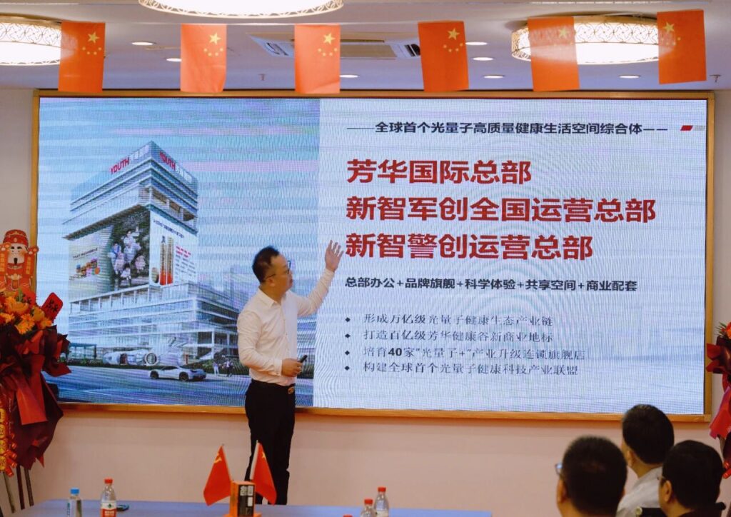 座谈会上,杨泽鑫董事长向各位领导专家,详细介绍了芳华国际控股集团深耕生命健康功能光学领域 20 余年的技术沉淀与研发成果,全面阐述了集团以独家光量子科技为核心,锚定“健康中国 2030”国家战略,深度契合军民融合、乡村振兴、银发经济三大国策,构建全链条健康生态系统的发展战略与实践路径。